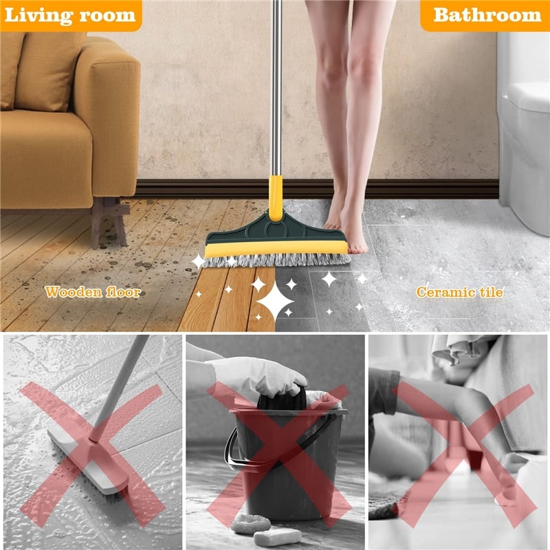 Served as brush and scraper, after brushing the floor, you can easily scrap the sewage. 120 degree rotating brush head, triangular convex bristles, rubber soft plate.